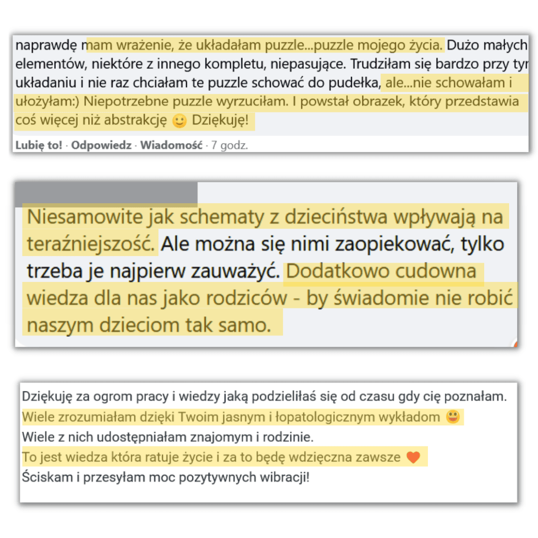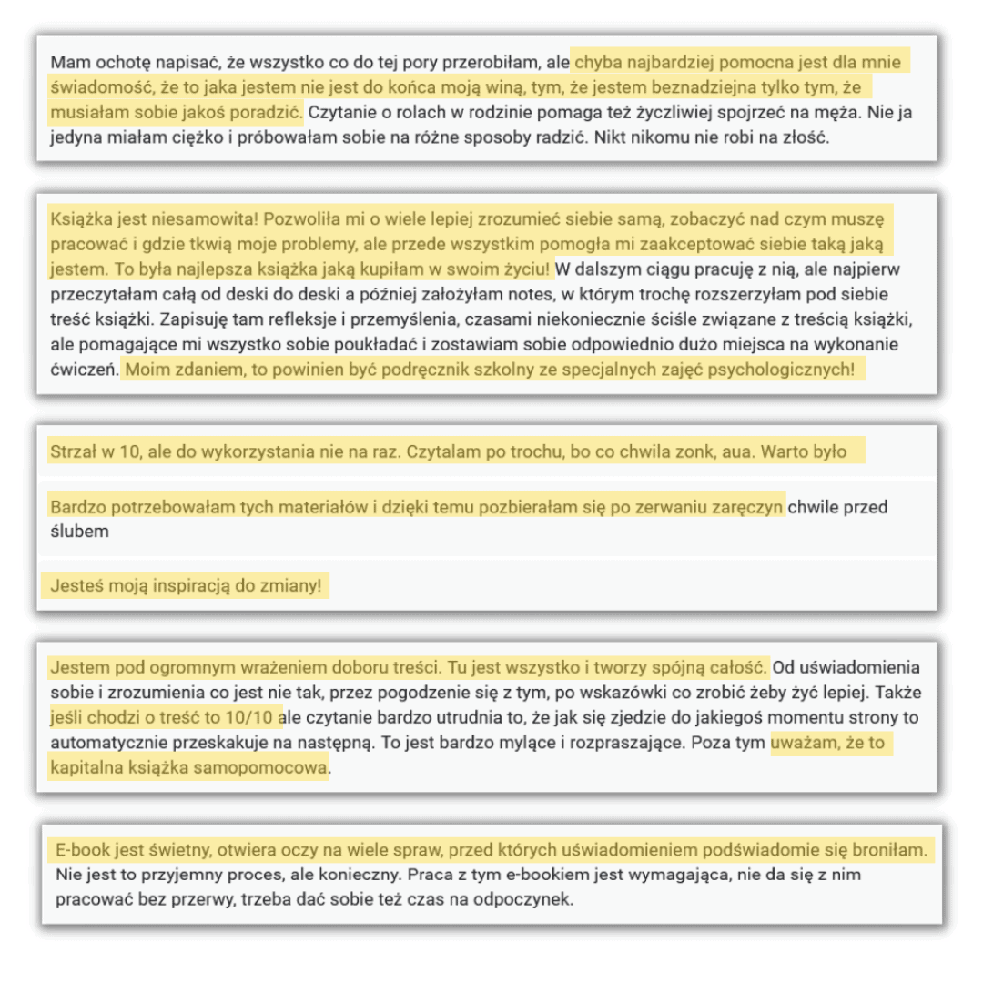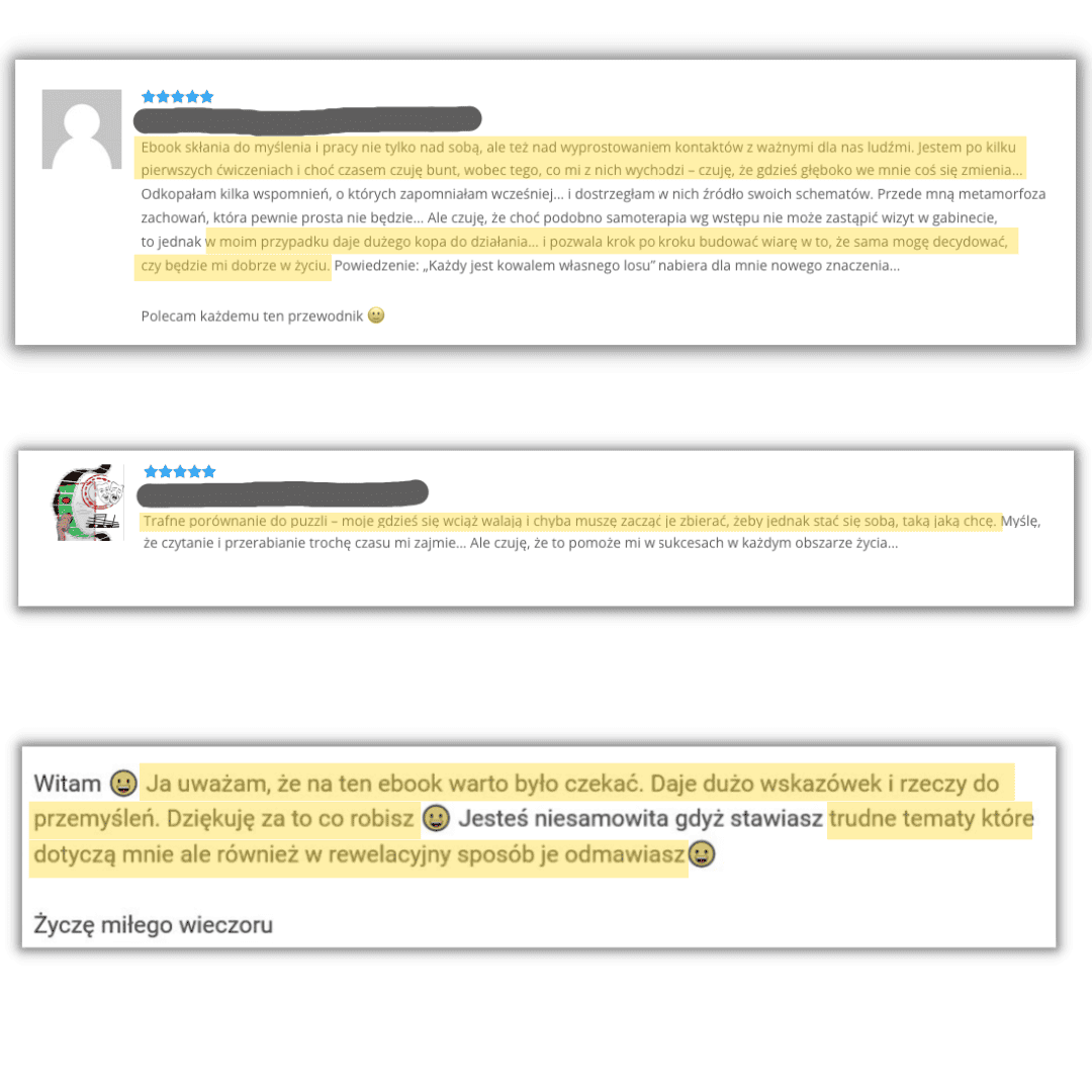 Ten poradnik to KOMPLETNA wiedza, która w pełni wyczerpuje ten temat. Nie zastąpisz nim terapii ze specjalistą, ale czytając go, poznasz wzorce, które wpływają na Ciebie destrukcyjnie i dostaniesz konkretne wskazówki, jak się ich pozbyć i zamienić je takimi, które Ci służą.