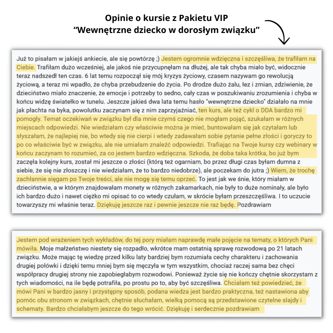 Ale jeśli chcesz, to nie musisz się zatrzymywać na poradniku – możesz teraz kupić PAKIET ROZSZERZONY z dodatkowym kursem “Wewnętrzne dziecko w dorosłym związku” (opis poniżej).